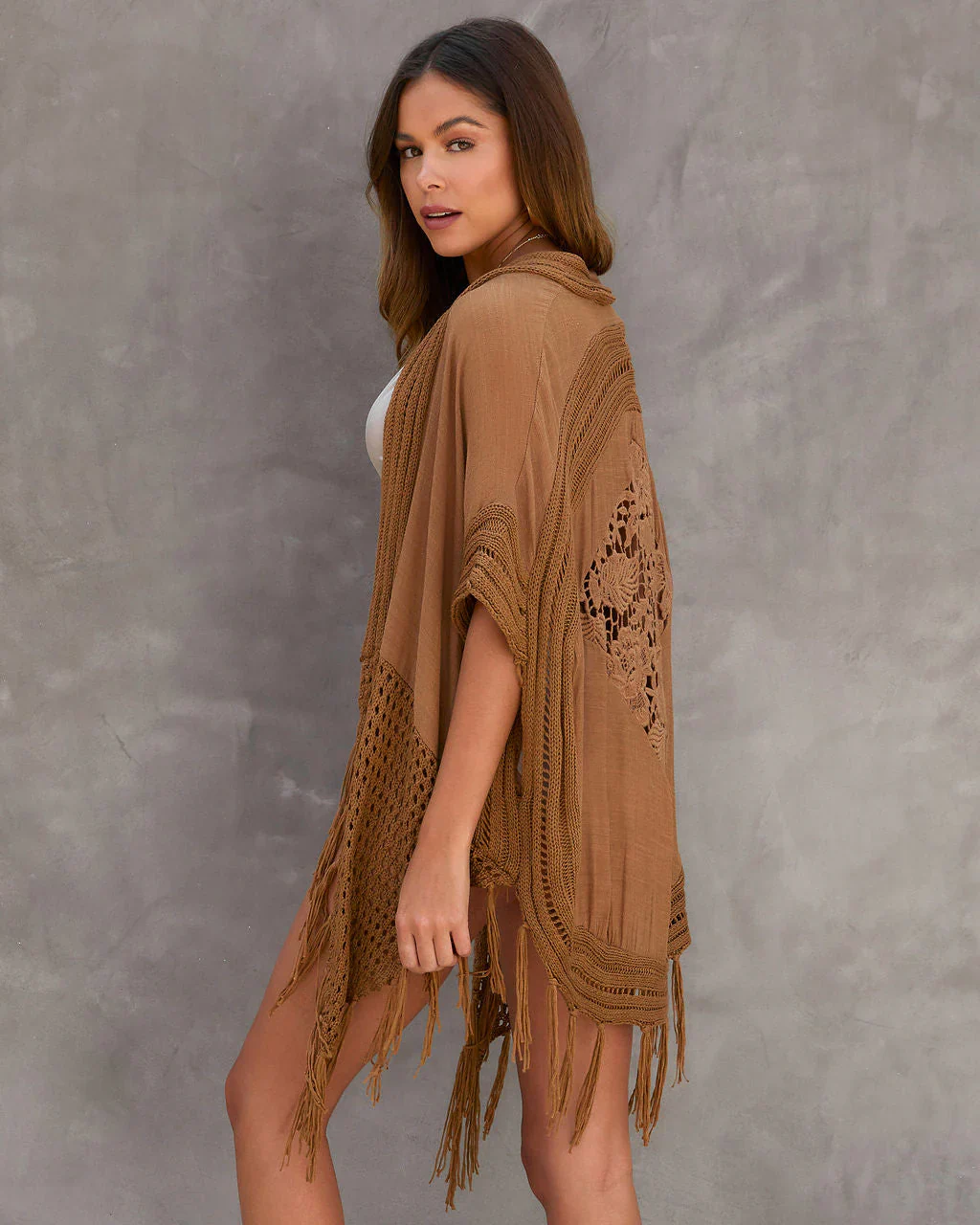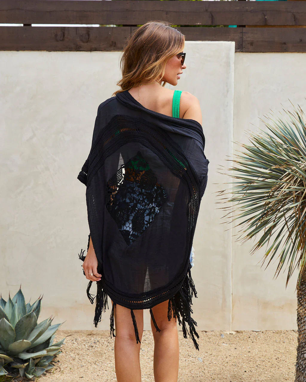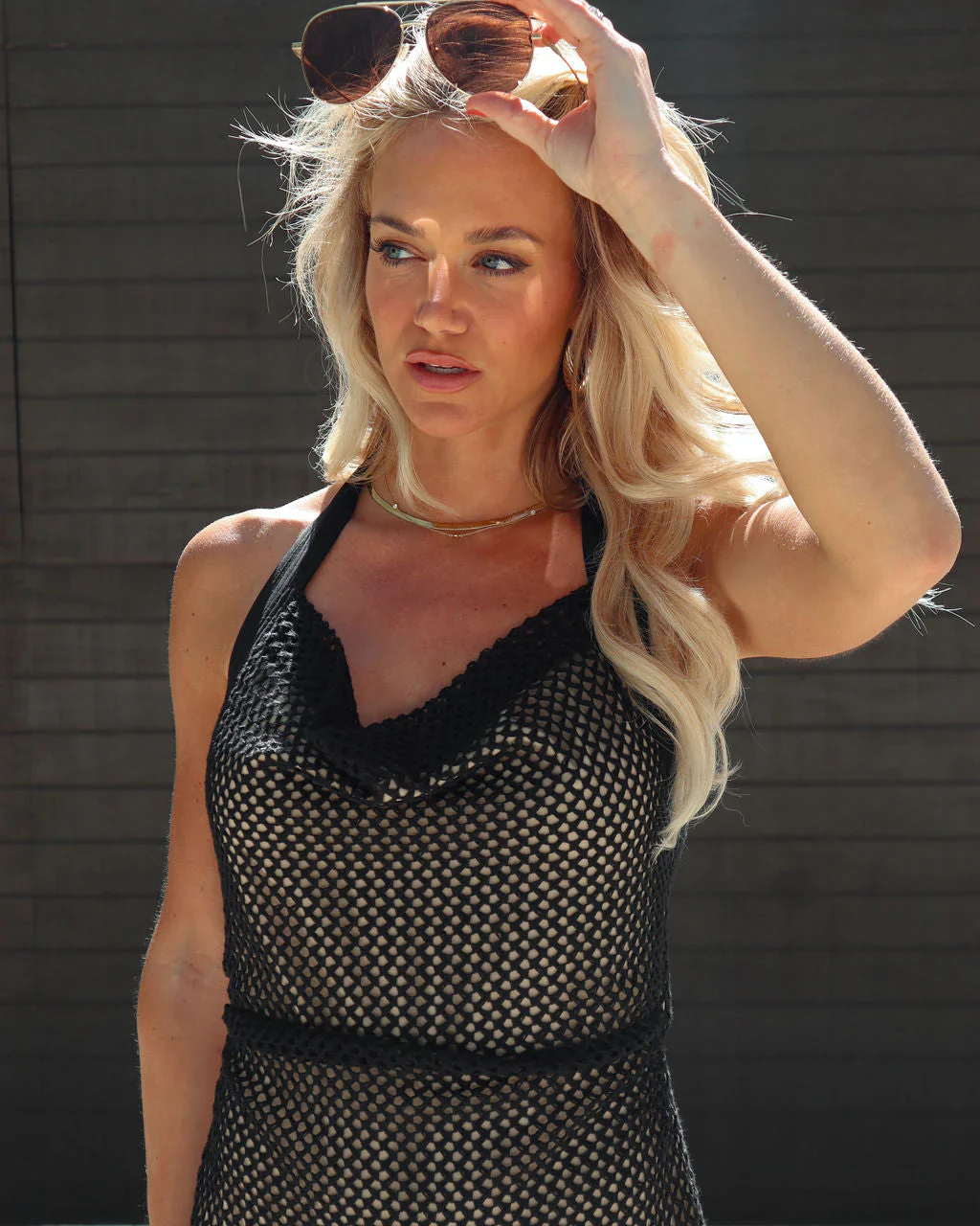 Playa Dreams Cowl Neck Tassel Trim Halter Mini Dress