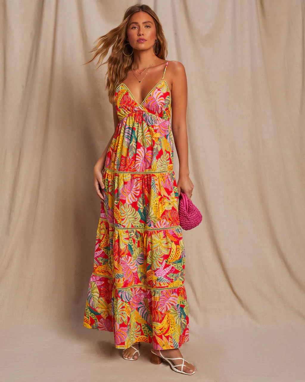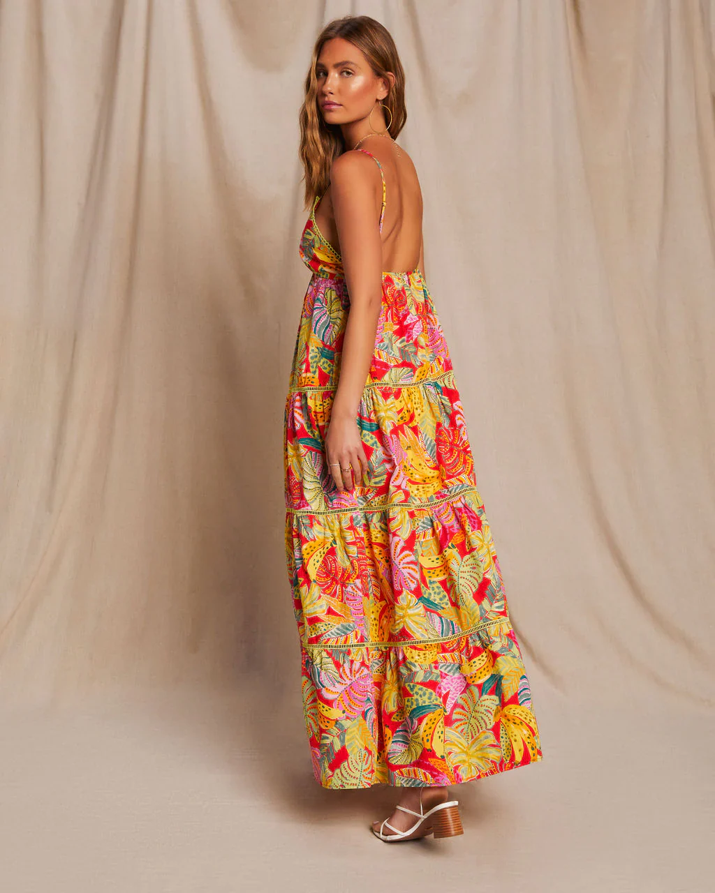 Fiji Tropical Tiered Lattice Trim Maxi Dress